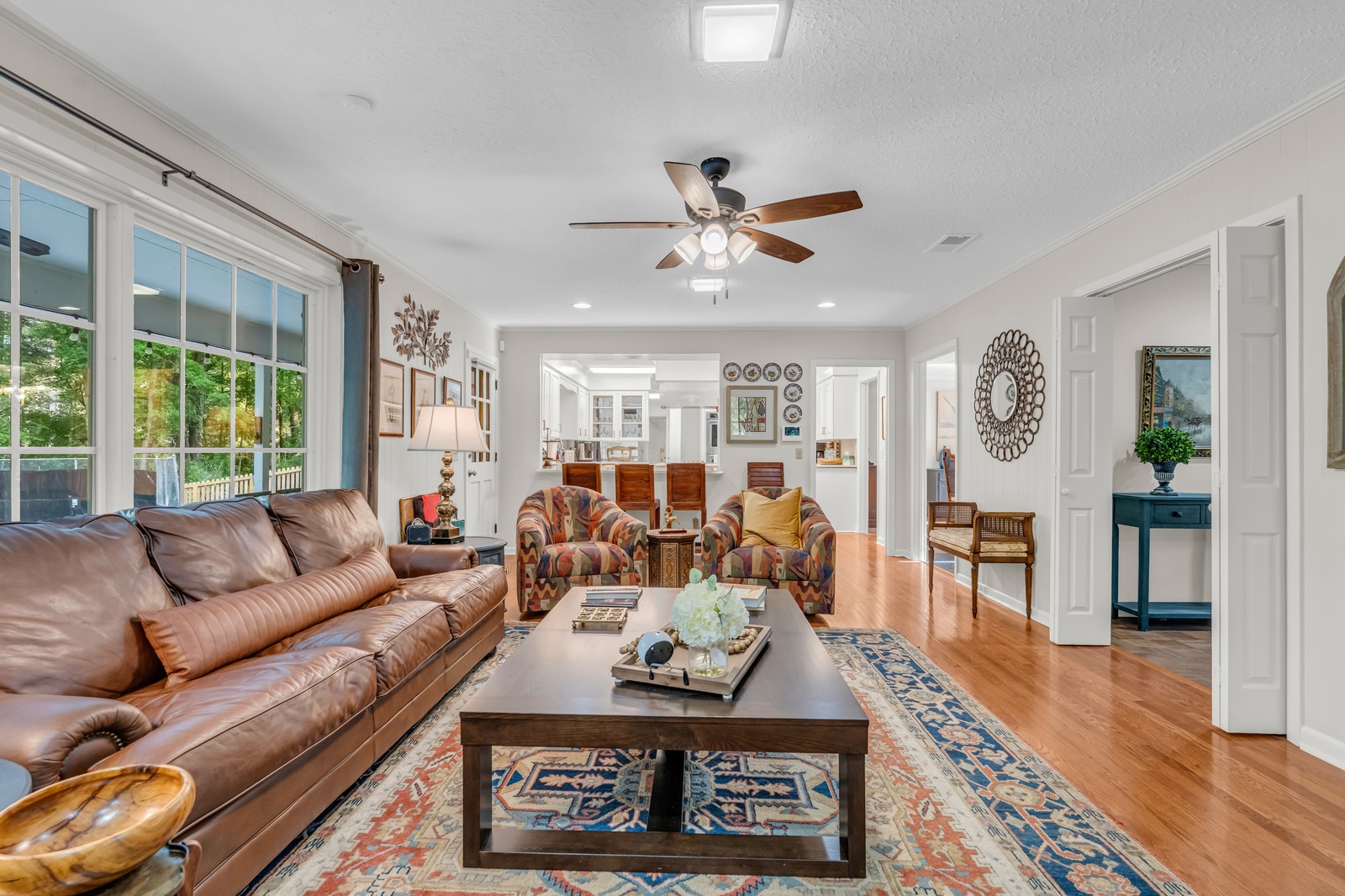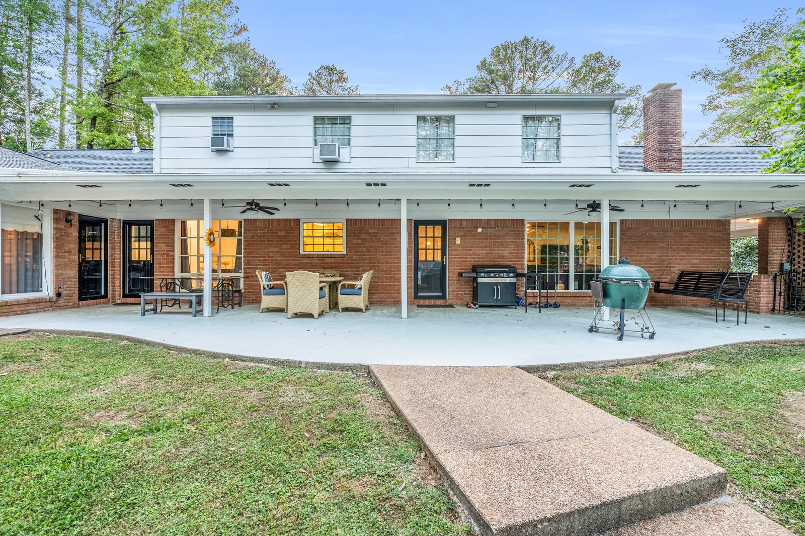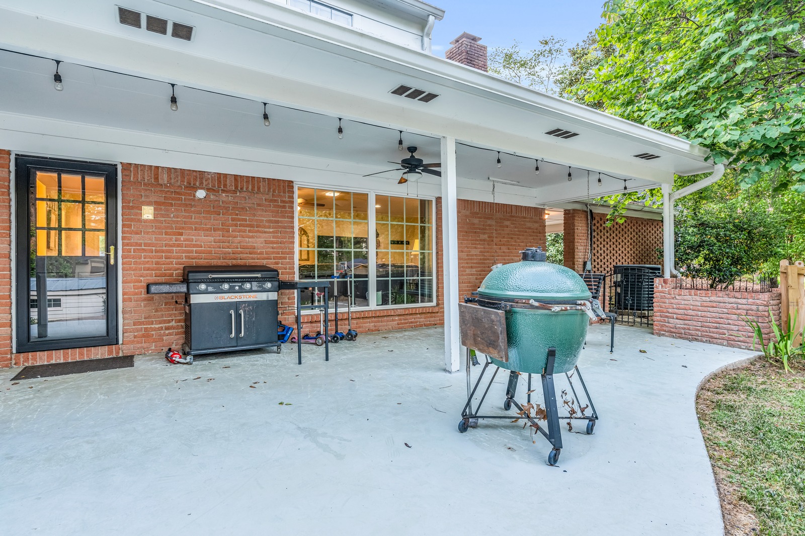 The rear patio runs the full length of the house — covered, ceiling-fan cooled, and strung with lights. Whether you're doing a slow smoke on the Big Green Egg or a quick griddle breakfast on the Blackstone, you've got everything you need outside.
